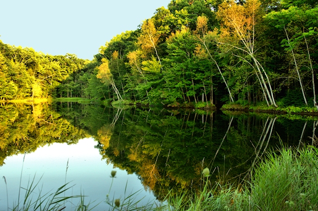 A man-made pond with no name (that I know of) lies in the middle of the back woods. A small cabin sits at the far end on the left side. Imagining a moose along the shore is easy and more than just whimsy; we have seen moose tracks in the boggy area in the pond’s drainage stream.