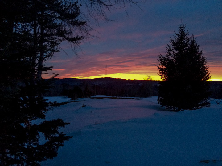Last week during the January thaw in mid-March in central Maine, we had a great unplanned sunset show. I got stuck behind a slow driver while the best part of the sunset occurred overhead. Here is what I was able to capture when I got to the local hilltop.