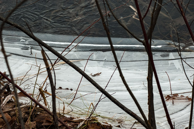 The no-name pond struggles to decide whether to be frozen or liquid; snow cover is diminishing by the day as February proceeds to spring.