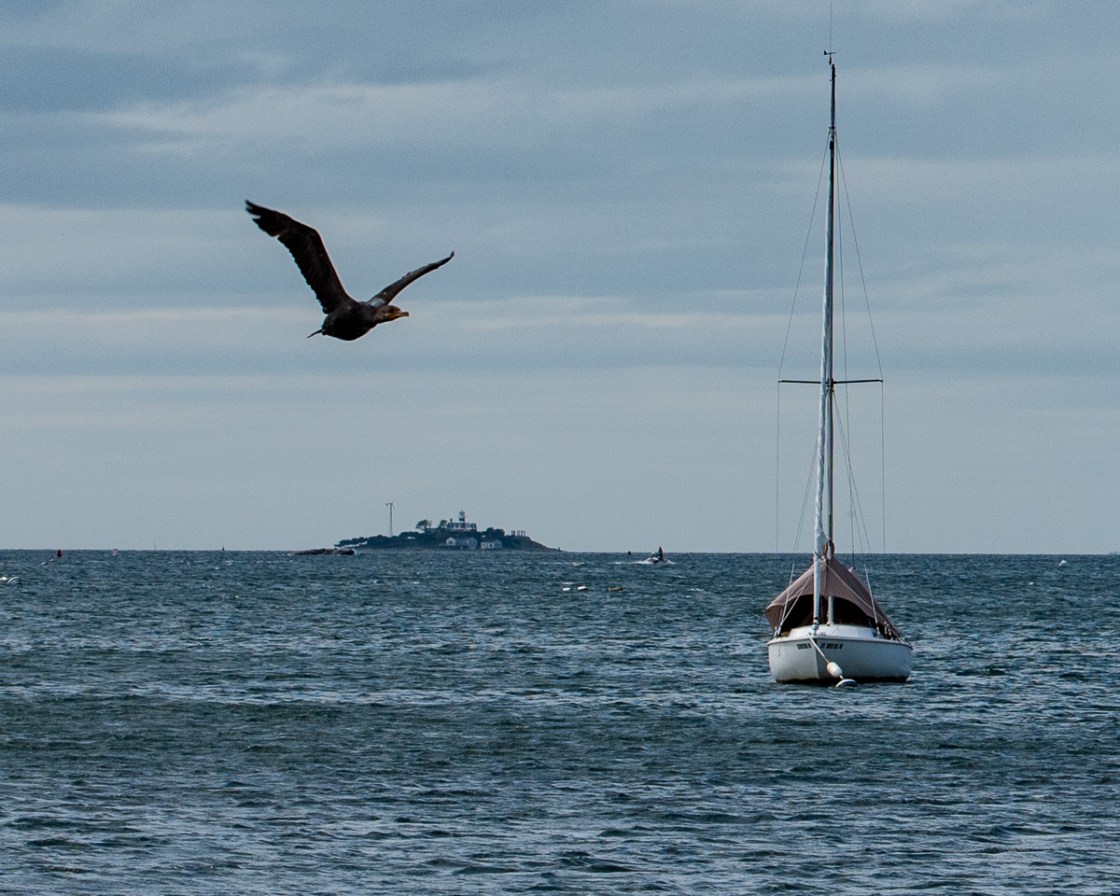 A single cormorant arrives at Poggy Bay in Connecticut; Fisher’s Island Sound provides the background and North Dumpling Island in NY state is on the horizon