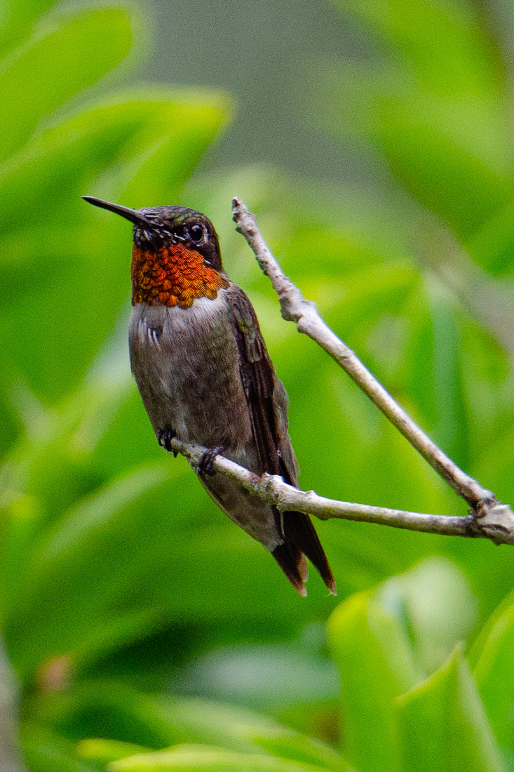 Last weekend the hummingbirds were feeding regularly at my brother’s feeder. I concentrated on getting a shot of one in the nearby trees and found this one at the perfect angle to show off his colorful throat.