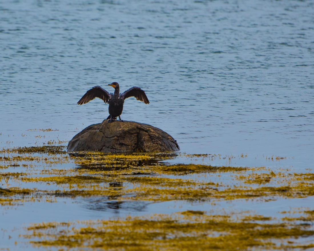 A cormorant dries its wings after a rainy morning along the Connecticut coast. This is a typical behavior of the species; they do spend much time cruising on and below the ocean surface but other birds that spend a lot of time in the water do not seem to dry out the same way.