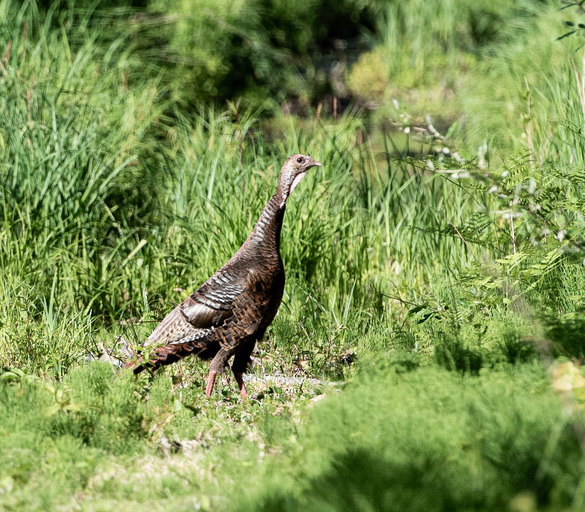 We sat by the old rail trail along the bog created by beavers a decade ago. Then, a modest sized turkey, just one! flies onto the trail near us. A star is born.