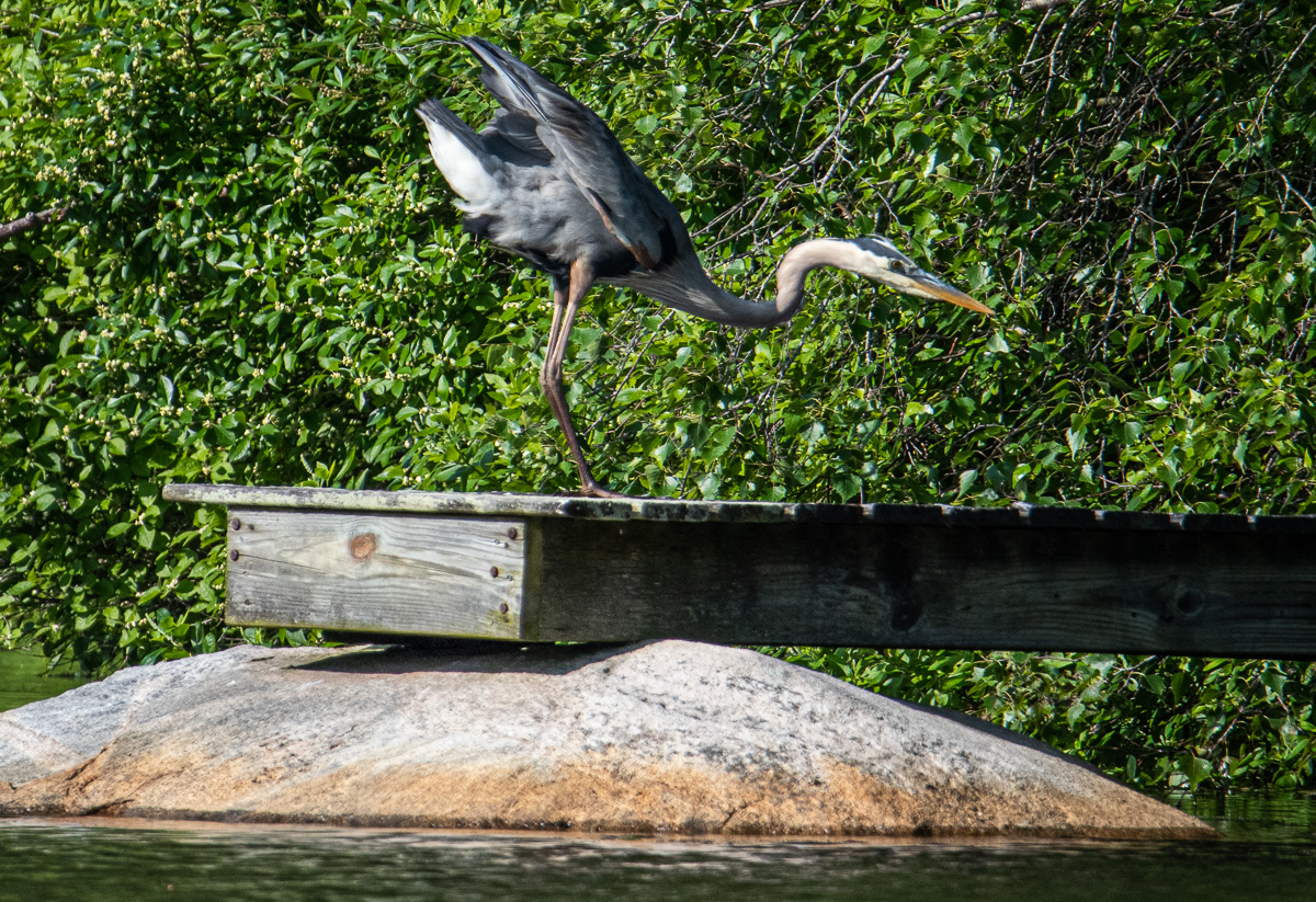 A great blue heron stands on this dock on the east side of the ice pond for hours. Late one afternoon while I waited for him to do something, anything!, he turned to his left and took a bow. He then slowly walked off stage.