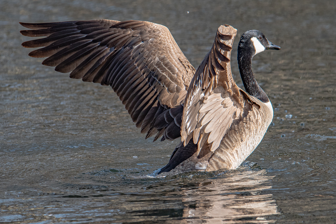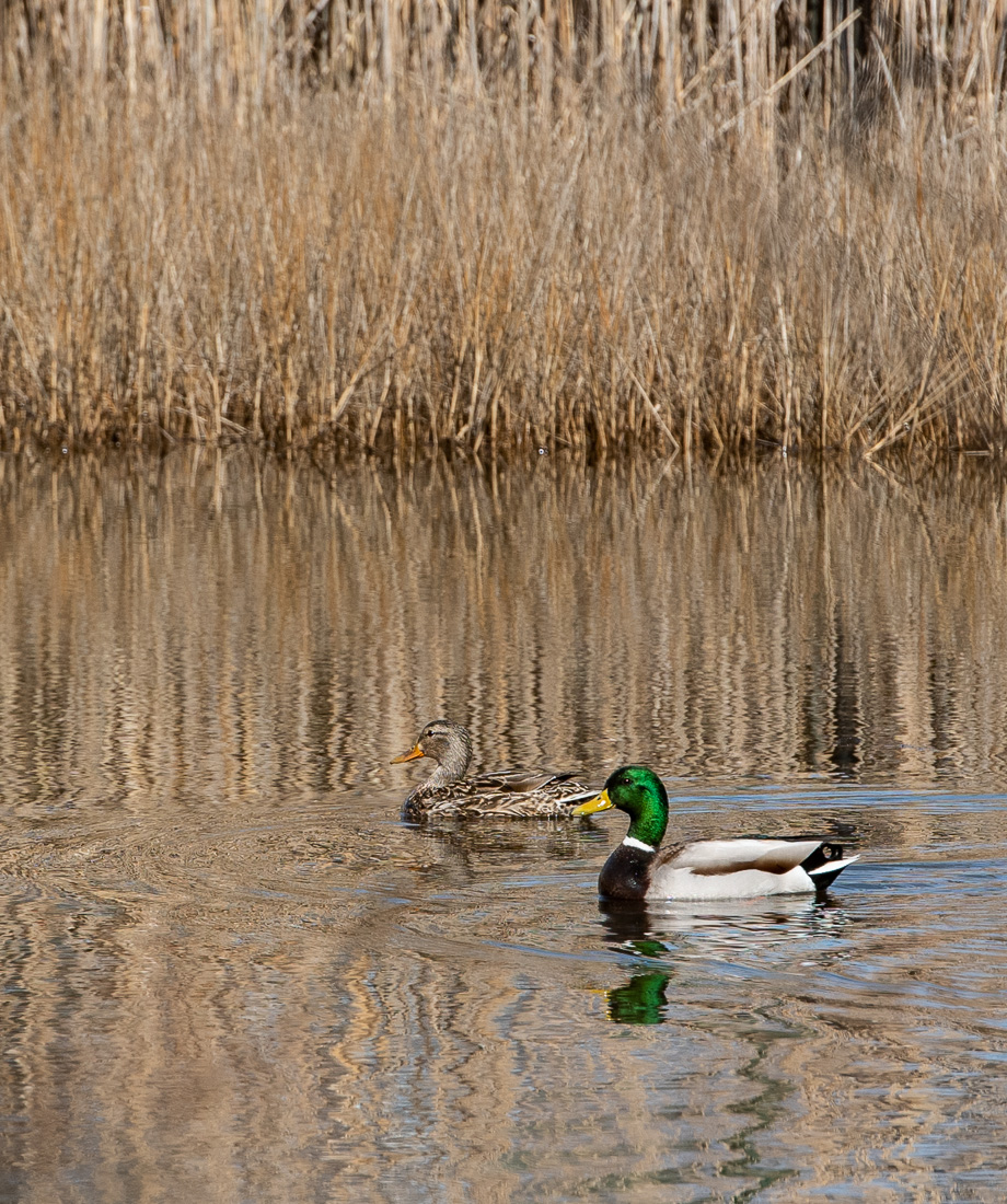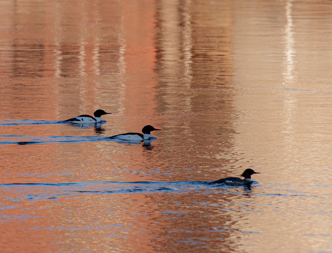 Early this week while walking along the banks of the Kennebec River in Augusta, Maine, these common mergansers were traveling upstream. The reddish reflection comes from the brick buildings along Water street.