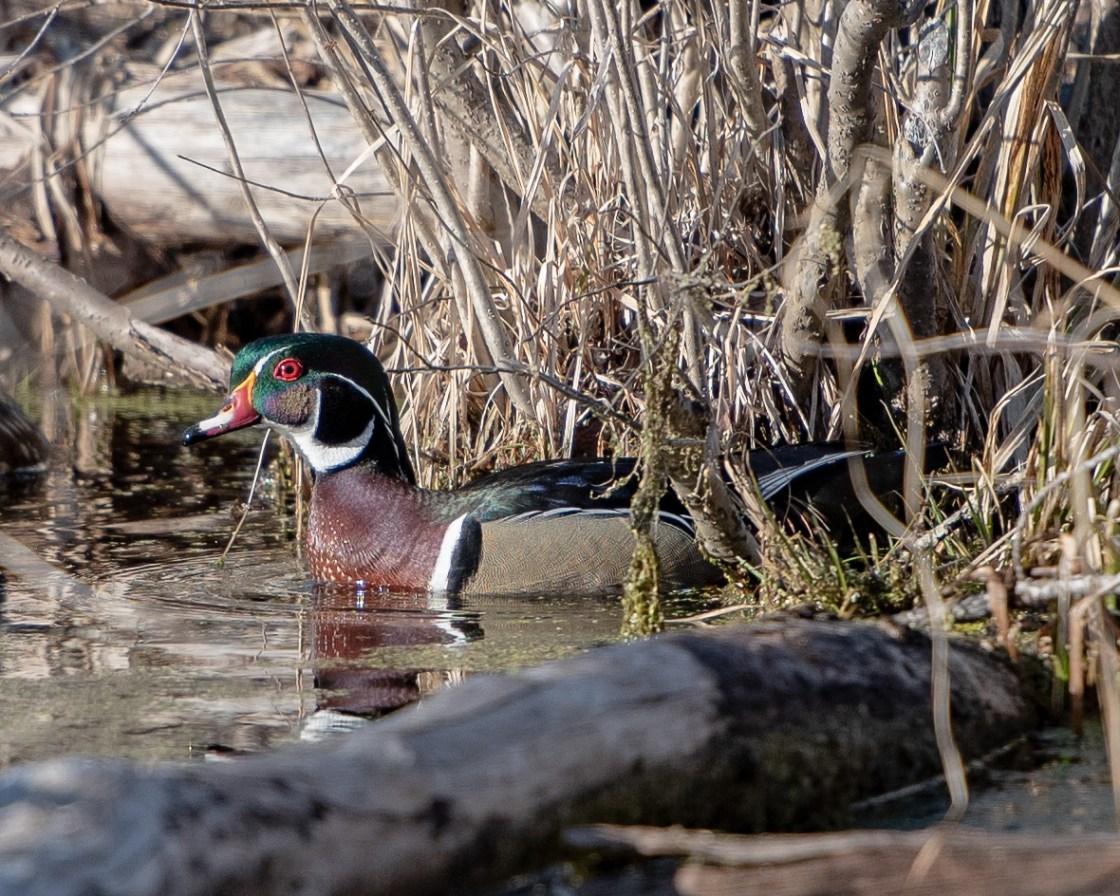 A lucky break while creeping along the far bog last week. A pair of wood ducks were foraging and did not realize my presence.
