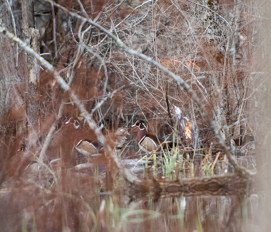 You can make out four wood ducks in this view. There were at least six floating around on this side of the middle bog.