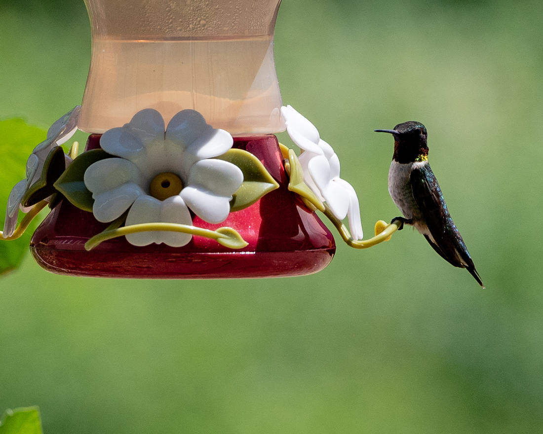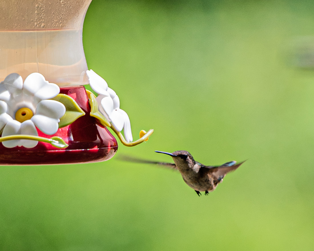 Introducing hummingbird-2; this bird has started to visit either alone or at the same time as hummingbird-1. When both arrive together, they start to circle in a dog-fight!