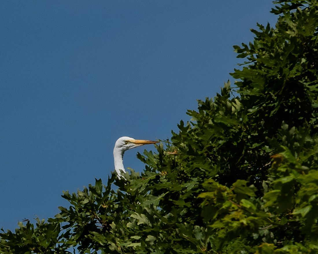 While walking on the edge of the Great Marsh in southeastern Connecticut this weekend, we disturbed an egret sitting in a tree. The bird flew back along the trail and settled on a new perch. It just so happened to be on our way back, so we got an image of the bird anyway.