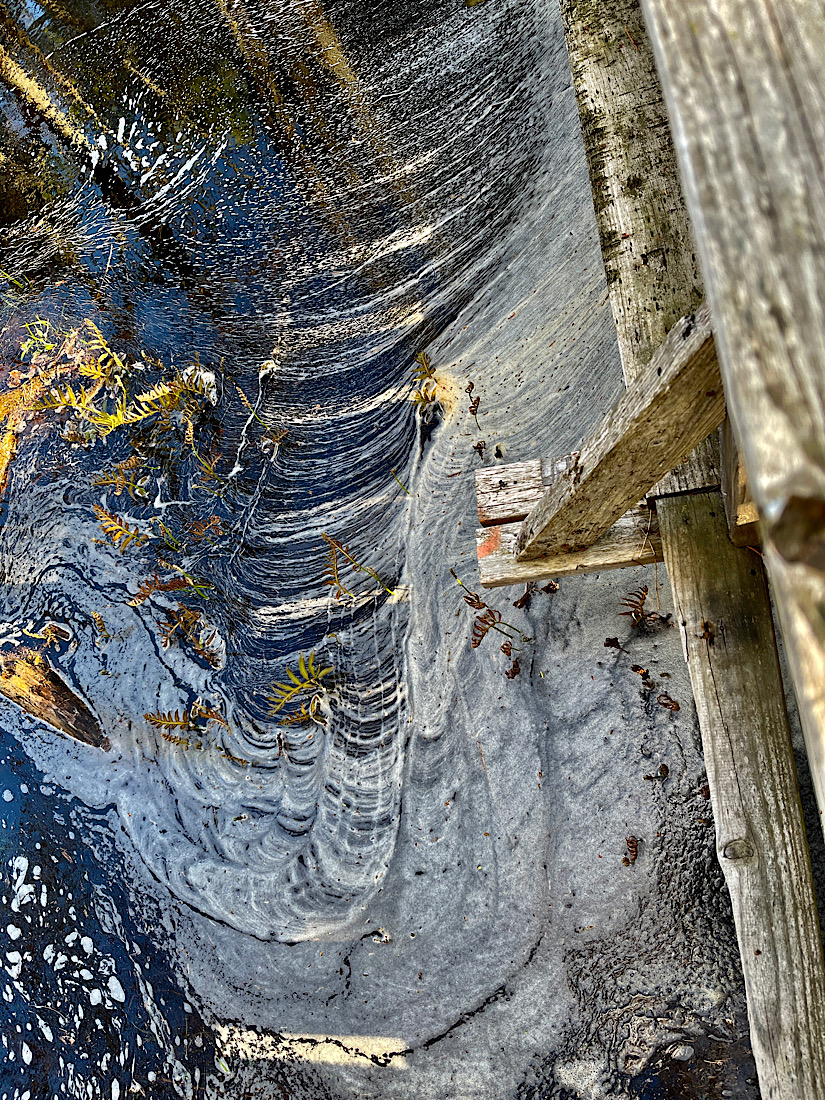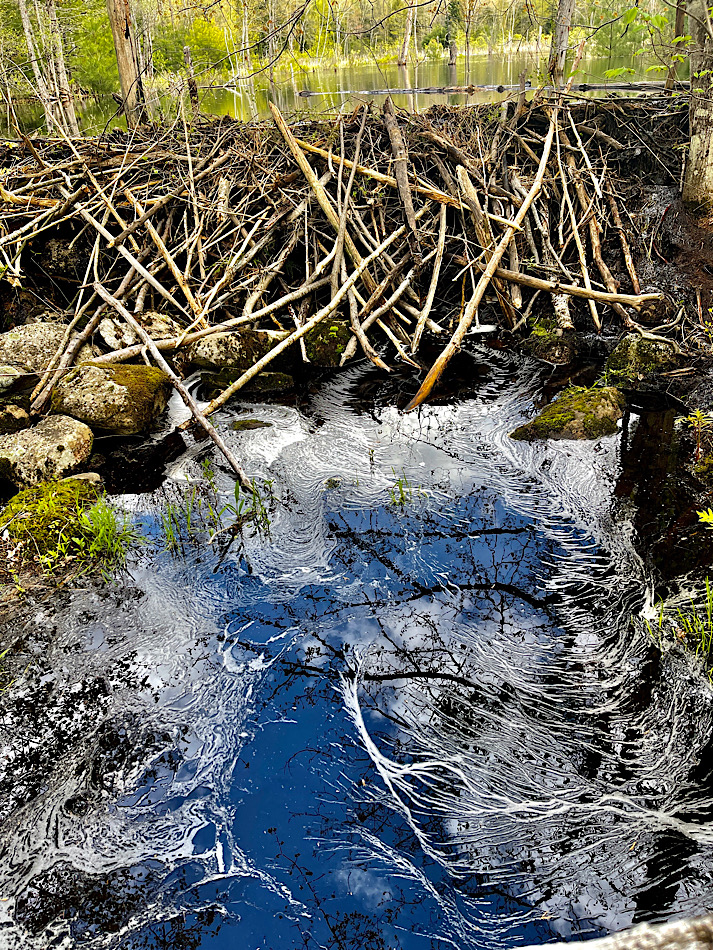 The latest beaver dam has now re-created the pond that existed about twenty-five years ago when the beavers first flooded the area now known as the beaver bog. You can see the new pond at the top of this image. The water that has leaked through the dam, seen in the lower part of the image, makes the image you see in the previous post.