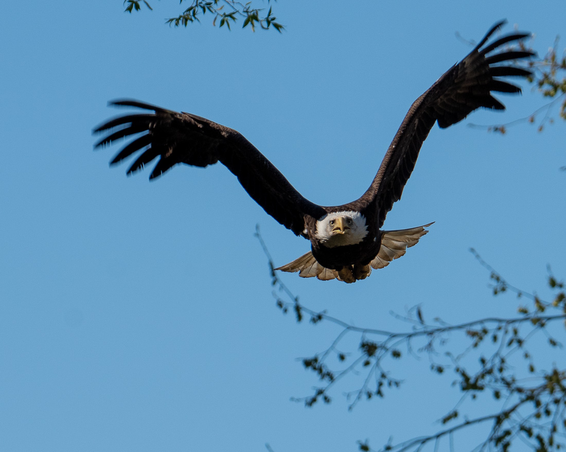 While walking along the Augusta Greenway on the east side of the Kennebec river in Augusta, Maine, today, I was approached by two eagles. After they briefly wrestled with each other above me, screeching the whole time, one went and sat on a branch ahead of me. Then, the bird leapt from the branch, flew over my position as you can see here. It did not threaten me (perhaps my 150-600mm zoom lens looked like a formidable weapon) and departed as fast as it had arrived.
