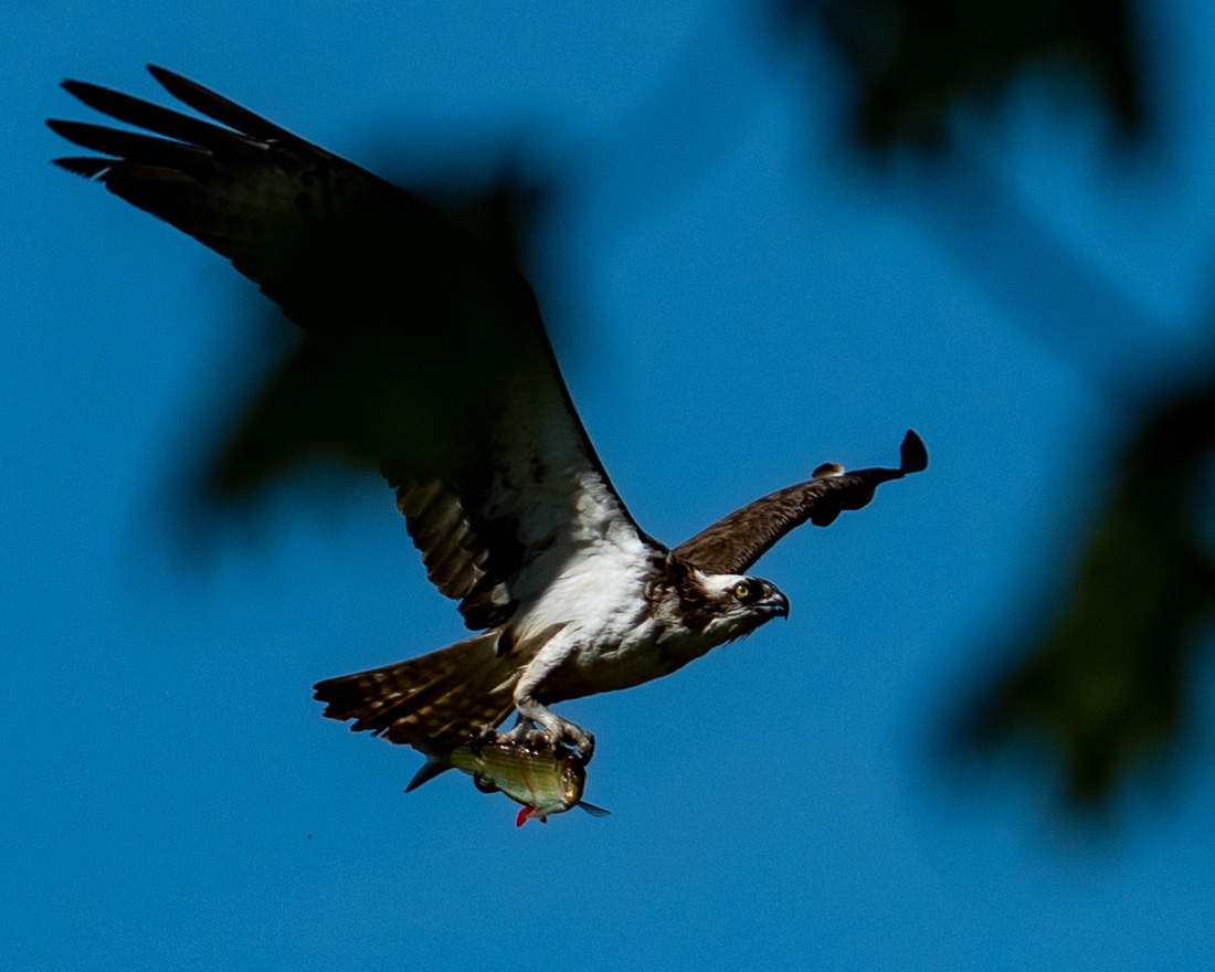 During my walk along the Augusta Greenway on Friday last, I was surprised by a pair of eagles appearing overhead (see my previous post). Not long after that event, while sitting down on a stone block by the Kennebec Arsenal property, a lone osprey cruised north over the Kennebec river at about 40 feet. Suddenly, right in front of me, the bird dove straight down and Bam! It pulled out a fish and then, while I scrambled again to get my telephoto lens unlocked, auto focus engaged, camera turned ON!, it rose up off the water right toward me and then leveled off, heading to the right as if to show me the goods. What am I, an Inland Fish and Wildlife warden now? The overhanging trees are blocking some the view here, but thank the gods for all my Nikon and Tamron technology!