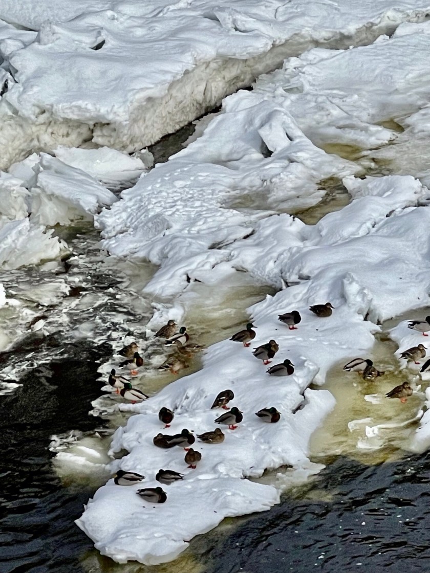 A large group of mallards were found hanging about on the Kennebec River shoreline in Augusta (Maine) last week.
