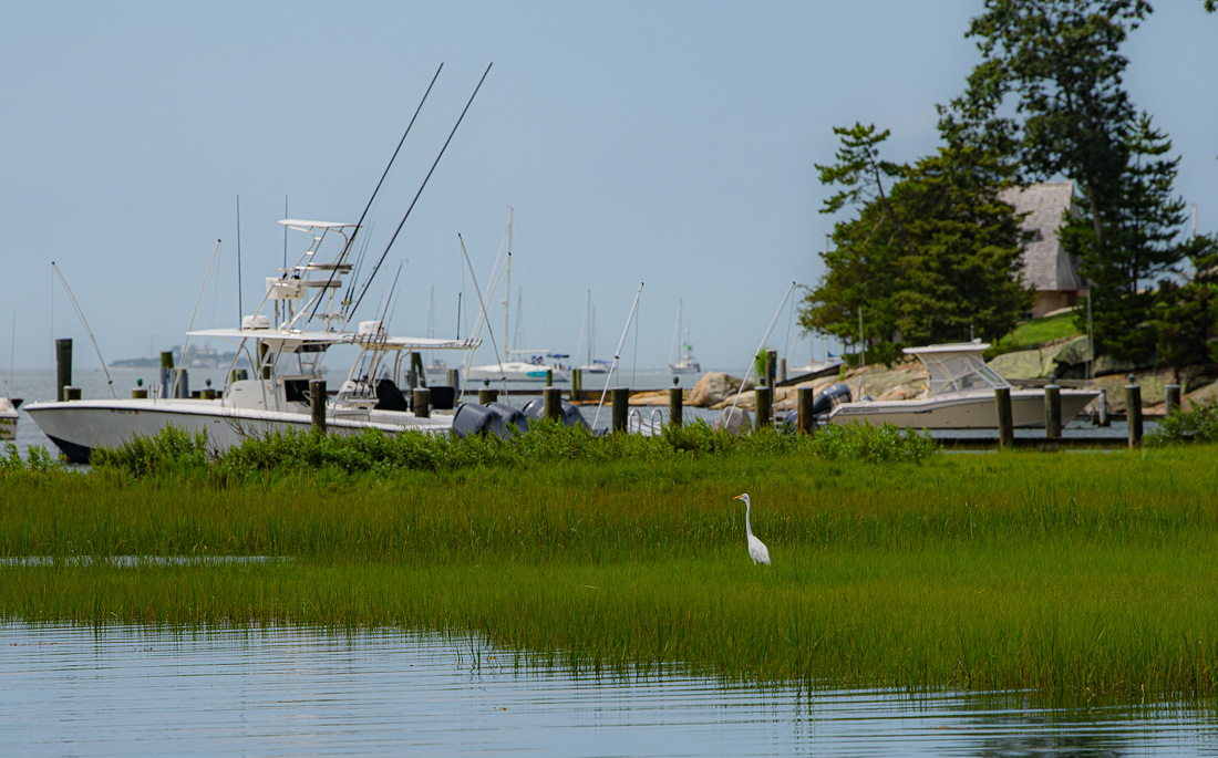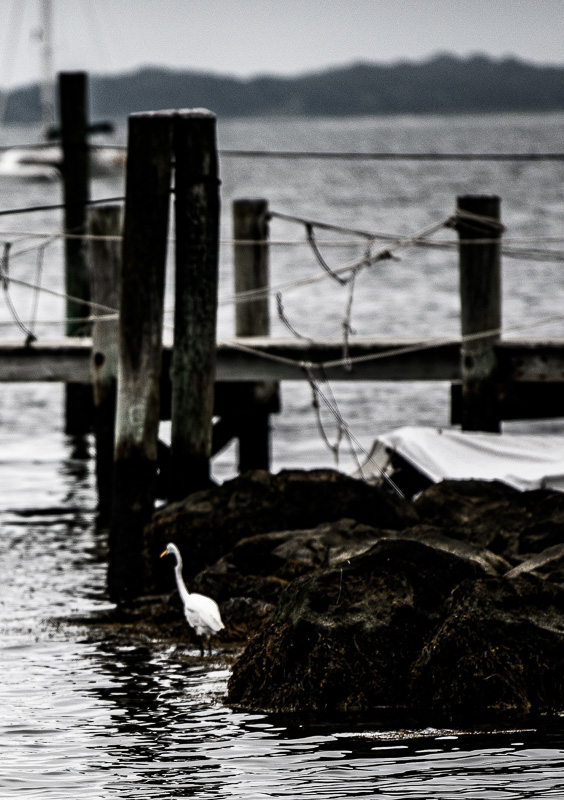 During this recent summer visit to the Fishers Island sound area, there were egrets almost everywhere one goes. Are they close enough for a great image or are they poking around beautiful natural settings? Near Allyn’s Alley, this one may have been looking for food, I guess.