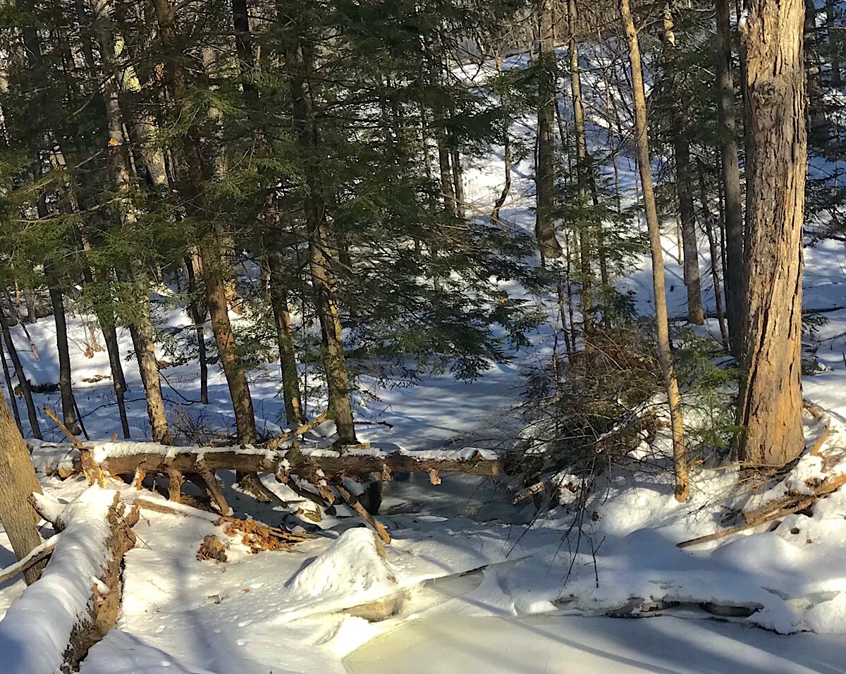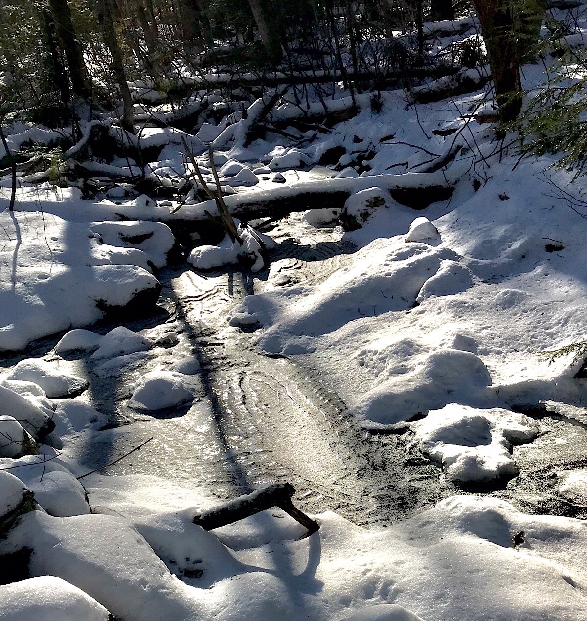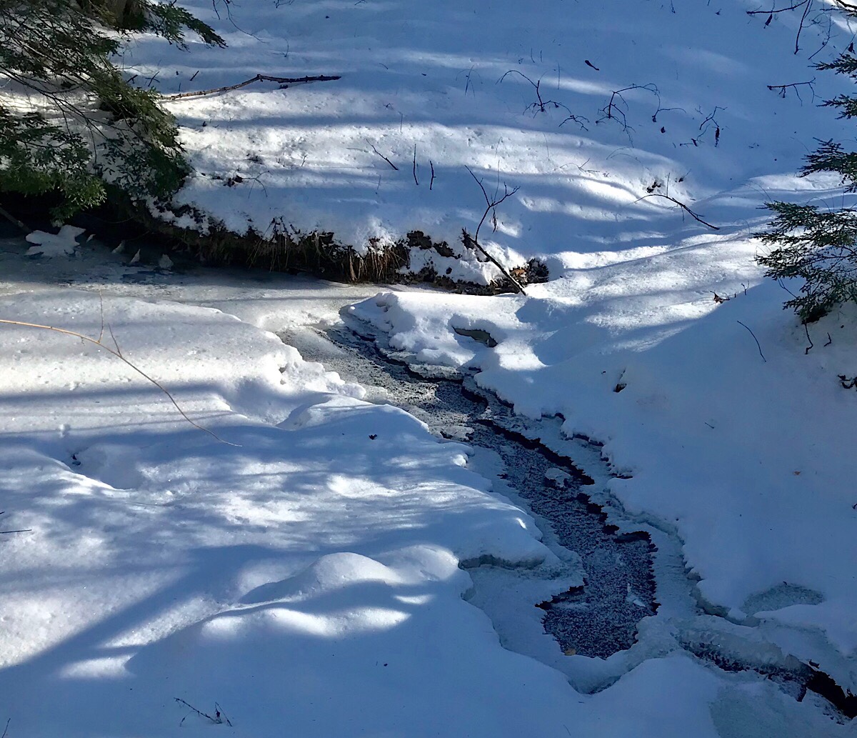 The variable cold weather so far this year has stratified some of the surface ice on the local creeks and streams. This is the stream from the beaver bog and it is still flowing underneath the ice you see here. Most of the snow cover is very crusty and icy, also as a result of some dramatic temperature differences among our storms this season.