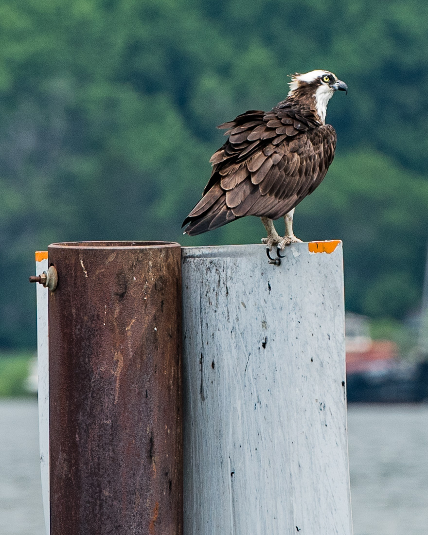 An osprey stands on one of the few posts in the Bodkin creek estuary that has no nest.