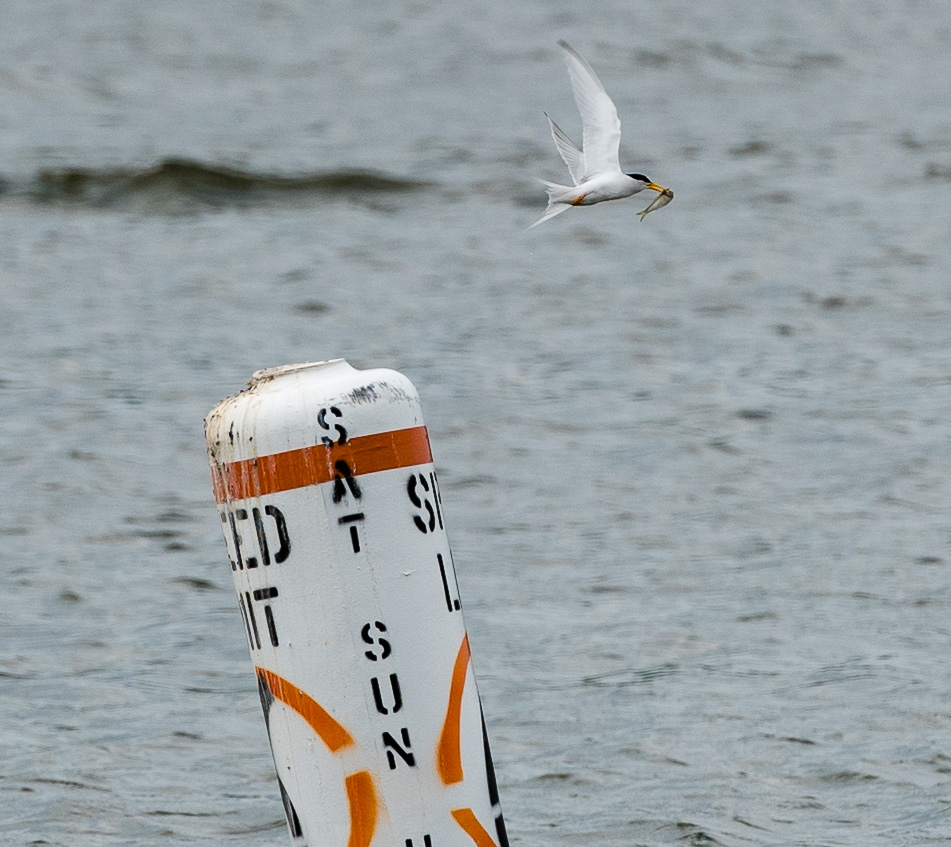 While we were leaving the harbor for our fishing trip, this Caspian tern (we think) managed to grab a small fish as we went by.